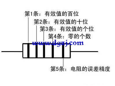 電阻器上用不同顏色的環來表示電阻的標稱阻值,常見的電阻器有四色環電阻和五色環電阻。四色環電阻,一般是碳膜電阻,用三個色環來表示阻值,用一個色環表示誤差。五環電阻一般是金屬膜電阻,精度更高,常用四個色環表示阻值,另一個色環表示誤差。